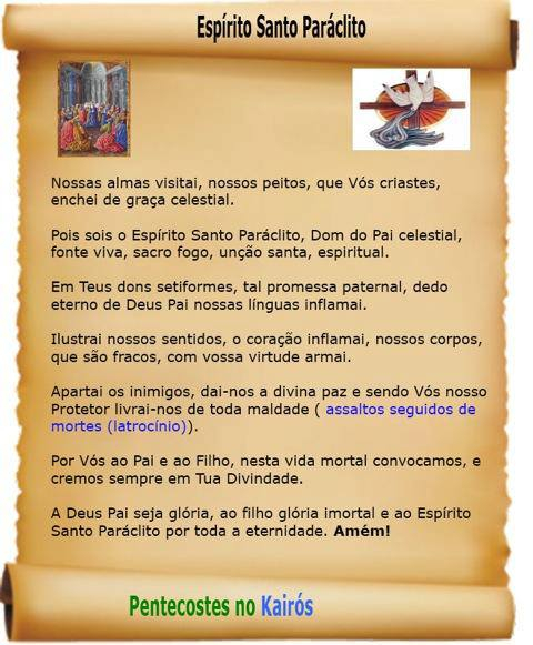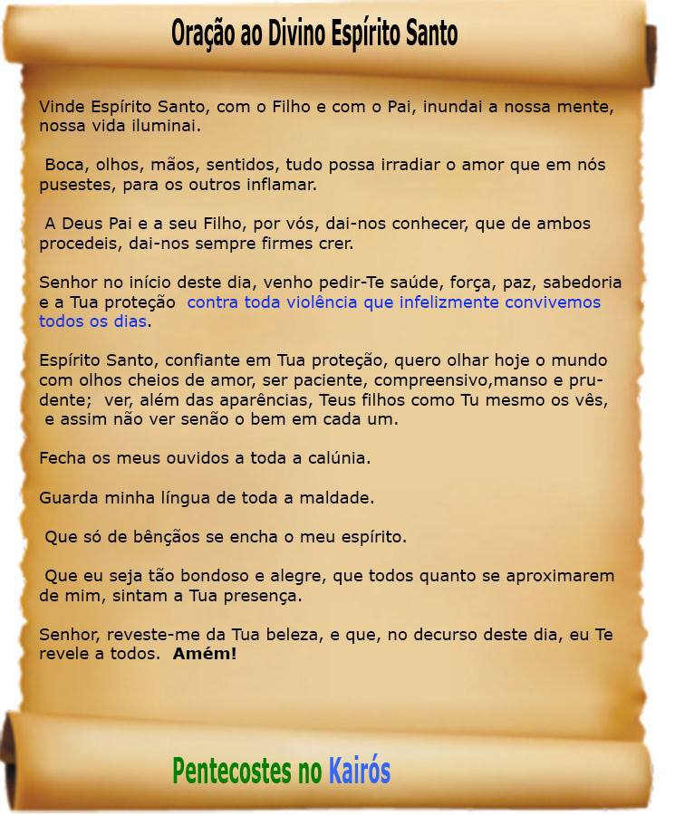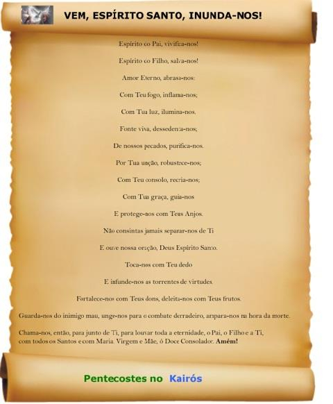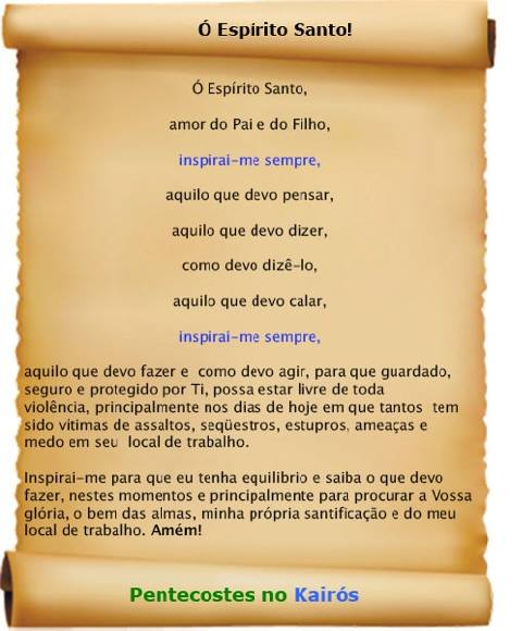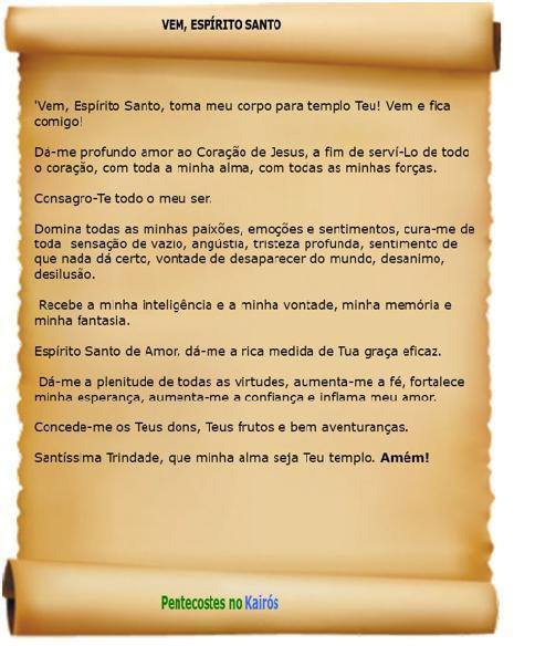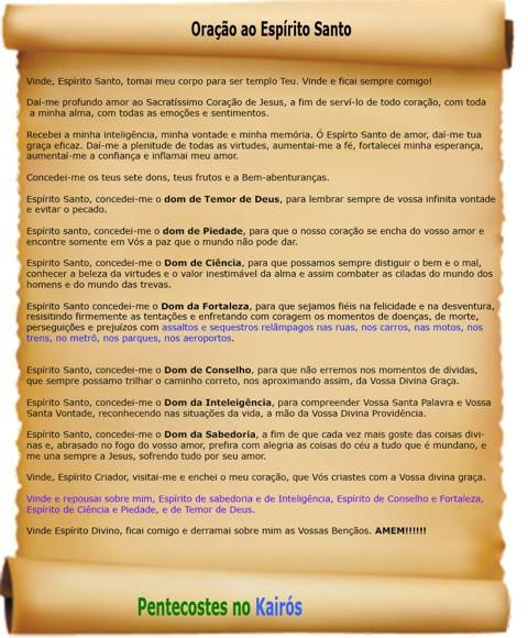 Eu peço agora, ó Espírito Santo, batiza-me, renova-me e libere em mim os Teus dons, para a Glória do Pai, do Filho † (sinal da cruz) e do Espírito Santo. Amém!