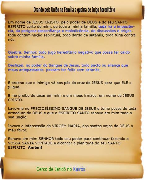 Em nome de minha família, eu (diga seu nome) rejeito toda influência má que me foi transferida hereditariamente.