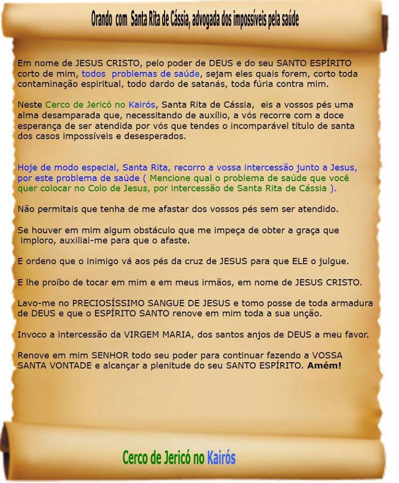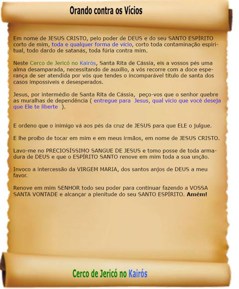 Eu renuncio a todos poderes e a todos favores que eles buscaram fora de Jesus; eu os rejeito em Nome de Jesus † (sinal da cruz); eu renuncio também a todas as enfermidades decorrentes destes pactos, em Nome de Jesus † (sinal da cruz).